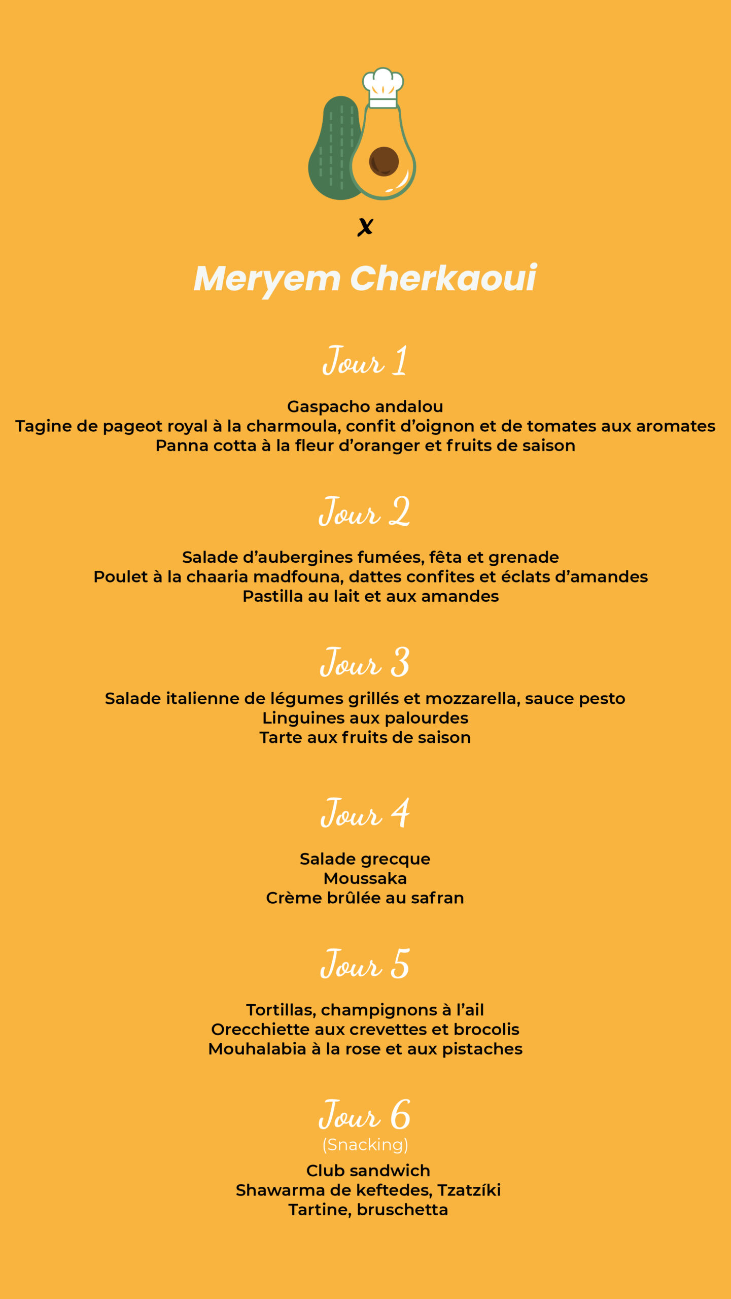 Ajouté aux plats traditionnels que maîtrise déjà votre cuisinière, les menus de cette formation ont été conçus pour constituer une carte complète de restauration, conçue par la Cheffe renommée Meryem Cherkaoui.
